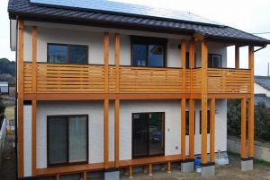 採光と通風を考えたパッシブな住まい LDK:アイランド・キッチン LDK吹抜け 吹抜け二階廊下 和室:床の間・仏間 玄関ホールと坪庭 構造躯体の木質バルコニー 檜材のベランダ:通風腰パネル 檜材の板張りベランダ 木質バルコニー外観デザイン 木質バルコニー:パッシブデザイン アール・デザインタイル玄関