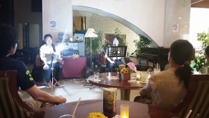 2016年7月24日 ジャズ&ボサノバ 水口 政章さん & 岡 侍秀さん のジャズ&ボサノバ ホールロビー・ライブ 日曜日の夜 に嫁さんと二人で行ってきました。 演奏は1時間の ワンドリンクオーダーのみで ギター & ベースのボサノバ演奏に癒されました。 少し体調が良くない僕ですが、あったかい曲と優しいボーカル とても心地よく 身体をいたわっていただいた気がします。