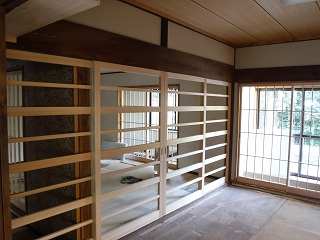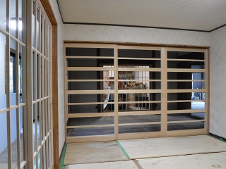 2016年12月27日 旧家再生工事の工事状況 築100年に近い旧家の再生工事中ですが 平成28年の年末も迎え、今年もあと少しですが 先週末から仕上の段階に入っております。 外部の土壁造り砂聚楽壁は、仕上材にて左官塗りも 完了出来ました。 昨日・今日で一部分の木製建具切り込みを行い 新年 早々に残りの部分を仕上げる予定です。 [ 洋間部分 ] [ 玄関ホール・廊下 ] [ 和室・洋間 ] 木製建具もかなり多く、手間を掛けて 慎重に作業を行こないました。 最後の仕上げとして、樹脂ガラス・障子を 切り込むと木製建具は完了です。
