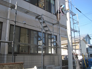 2018年2月15日 外壁タイルの防水工事 【 外壁の防水補修 】 事務所棟と作業棟の 外壁タイル防水シール工事で、 現場作業の為の工事用仮設足場を 撤去いたしました。 【 工事用仮設足場の撤去 】 【 窓のサッシ網戸の取り替え 】 網戸が固定され左右への引込みが出来なかったので、 今回の工事で新規オーダー製作で左右への 引き違いが出来る様に取り替えました。 昨日 工事用仮設足場を撤去が出来ました。 【 駐輪場 】 今日は駐輪場の屋根パネルを 新しく張替えました。 これで予定全ての工事が完了しました。
