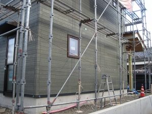 2018年7月8日 新築の外壁工事 6月初旬からの長雨で 外壁工事の進行がペースダウンして おりますが、ちょっとの晴れ間と曇りの日に 外壁工事を行っています。 少しづつは進んできています。 軒先部分の檜無垢板を張ることを 優先に施工をしてきました。 二階バルコニーの天井部が最終の施工で 軒天施工はこれで完了です。 同時に外壁サイディング張りも進めてはおります。 東面と南面は まだ防水シール張りの状態ですが 西面と北面は外壁サイディング張りは完了です! [ 一階の西面 ] 梅雨明け後には外壁廻りの施工を 主に進めていく予定です。