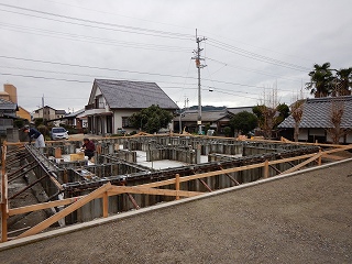 2019年1月7日 仕事初め 1月4日から 仕事初めです 新年の初仕事は 新築住宅の基礎工事 型枠へのコンクリート打設を 基礎業者さんと一緒に 行いました。 僕の作業は主に アンカーボルト入れ! 土台敷きの伏図を確認しながら 行います。 型枠の取外し後から 外部の給排水配管工事を行います。 1月末までには整地まで行う 予定で進めます。