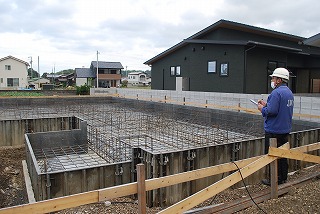 2020年10月24日 平屋建て住宅新築の基礎工事 【 平屋建て新築住宅の基礎工事 】 配筋検査も無事に適合で べた基礎コンクリート打設後の 外部・各部屋の基礎立ち上げ型枠 設置作業を行っています。 型枠の組立てが出来れば コンクリート打設を行います。 耐震等級3の住宅ですので 基礎補強配筋や間仕切り壁以外の 部分でも立上げ基礎を 増やしております。 平屋建て42坪の住宅ですので 間仕切り壁も多く 基礎が徐々に進むにつれ やはり大きな建坪であることが 感じられる様になってきました!